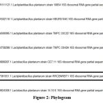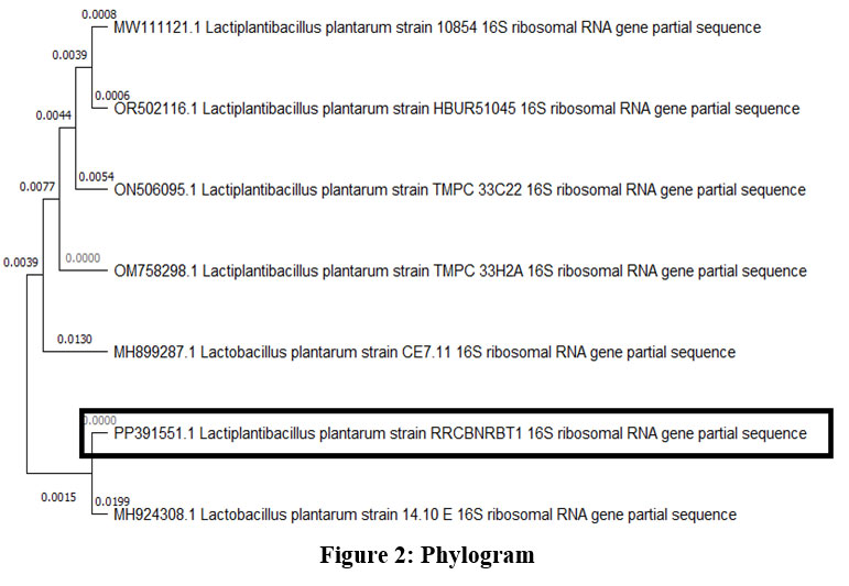 Molecular identification of the isolated bacteria was performed with Polymerase Chain Reaction (Figure 1) to amplify the 16SrDNA. Alignment of the amplified product of 16SrDNA gene from Gen bank database resulted in the identification of Lactobacillus spp as Lactiplantibacillus plantarum with 100 % homology and the accession number was PP391551 (Figure 2).