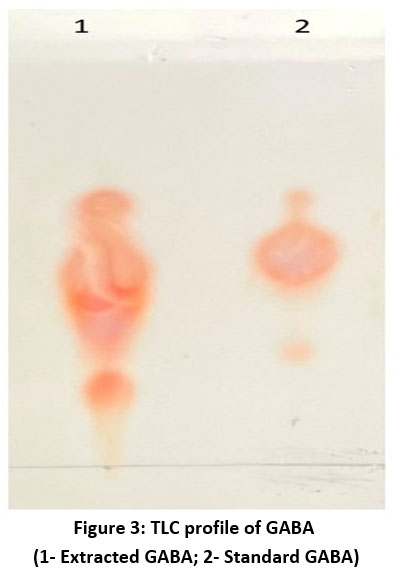 The presence of GABA was identified using a TLC study, the Rf value was recorded as 0.63, which was similar to that of standard GABA (Figure 3).