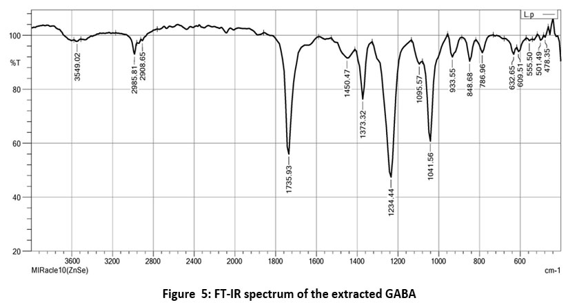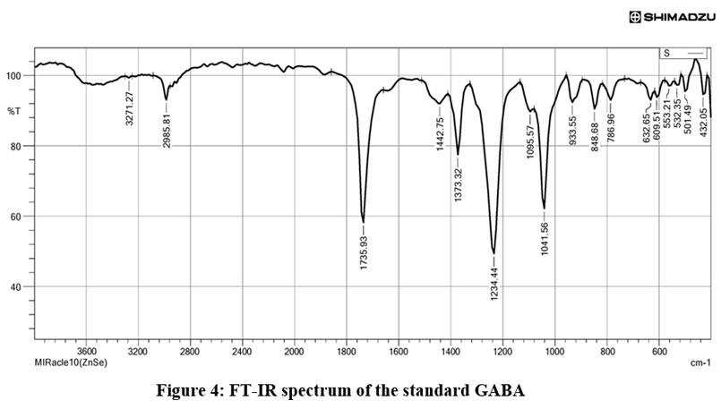 The FTIR spectrum of the extracted GABA was compared with standard GABA and 12 functional groups were observed as similar in both sample, which are Peaks at 2985.81 denoted the presence of CH weak, 1735.93 is the presence of C=O ester strong, 1373.32 – CH3 bend, 1234.44 C-O-C, 1095.57 and 1041.56 denotes the presence of C-OH stretch, 848.68 correspond to C-F bond, 786.96 – C-Cl strong, 632.65, 609.51 is corresponding to strong C-Br, 501.49 is denoting the presence of C-I strong bond respectively. FTIR results were presented in Figure 4 and 5.