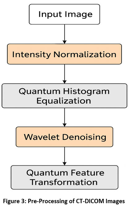 In order to enhance the raw data quality and boost the robust feature learning data-preprocessing is required. In this research study, quantum enhanced image processing pipeline is employed to refine the CT-DICOM images prior to segmentation and classification stage. The pre-processing consists of four stages such as i) intensity normalization ii) histogram equalization iii) wavelet-based noise removal and iv) quantum-based feature transformation.