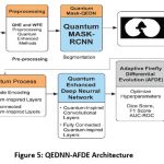 Quantum Enhanced Deep Neural Network (QE-DNN), Quantum Mask-RCNN (QM-RCNN), and Adaptive Firefly-Differential Evolution (AFDE) methods are used for feature analysis, deep segmentation, and hyperparameter tuning and optimization. The proposed framework utilizes quantum-enhanced pre-processing, enabling the model to detect subtle tumor characteristics better. The model aims to enhance diagnostic precision and clinical interpretability using intelligent, quantum-based bio-inspired architecture. Figure 1 shows the flow diagram of the quantum hybrid framework and its methodology.