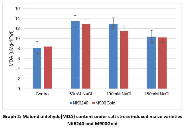In the case of Malondialdehyde (MDA) The trienoic fatty acids such as MDA directly contribute to reactive oxygen species (ROS) control via non-enzymatic oxidation and is directly correlated with the survival of tissues. The maize plants have shown decreasing trend with increasing salt concentration, exhibiting the adaptable nature of the varieties NK6240 and M900Gold.