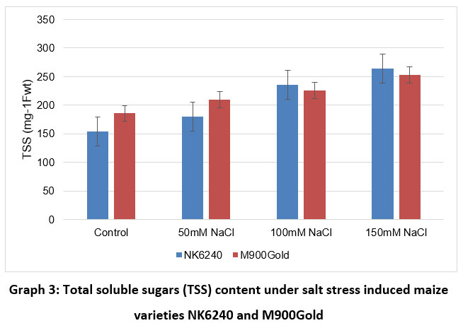 The elevated levels of soluble sugars contribute to tolerance of plants against stress conditions. Similarly, the maize plants have shown increasing levels of TSS with increasing salt concentration . The maize variety M900Gold have shown high levels of TSS than NK6240, indicating its sensitivity against salt stress.