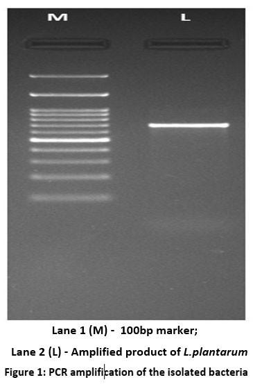 Molecular identification of the isolated bacteria was performed with Polymerase Chain Reaction (Figure 1) to amplify the 16SrDNA. Alignment of the amplified product of 16SrDNA gene from Gen bank database resulted in the identification of Lactobacillus spp as Lactiplantibacillus plantarum with 100 % homology and the accession number was PP391551 (Figure 2).