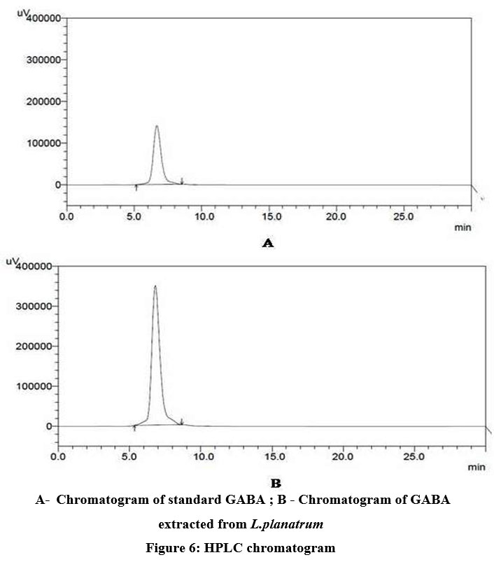 Further, the presence of extracted GABA was confirmed and quantified using HPLC study (Fig. 6), which revealed that L.planatarum can produce 1.8 g/L of GABA. Similarly other researchers also quantified the GABA with HPLC study and the amount may be varying based upon the organism and medium condition.
