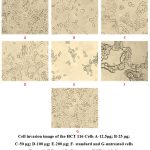 Human colon cancer cell line (HCT 116 Cell Line) was purchased from NCCS, Pune, India and sub cultured in DMEM medium (Himedia, India) with the addition of 10% FBS, 1 mM L-glutamine and 1% penicillin to avoid the contamination. Cells were cultured in a humidified incubator at 370C with 5% CO2 saturation for 72hours. Viability of the cells were confirmed with MTT assay by adding 100µl of cell line in 96 well plate with different concentration (12.5, 25, 50, 100, 200µg) of sample along with control (untreated cell line) and standard (doxorubicin-1uM/ml) for 24 hours. After incubation the cells were washed with trypsin and DMSO (50µl each) followed by adding MTT dye and incubated for 4 hours. Viability of the cells was measured using ELISA reader at 570nm and the percentage of viability was calculated in triplicates.20