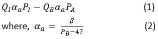 Here, β represents the conversion of air flow rate (QE) from BTPS conditions to standard temperature, pressure, and dry conditions (STPD). The barometric pressure is denoted by PB.