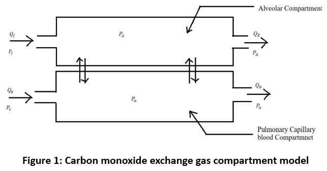 According to this model, the liquids and gases within the compartments are uniform. The time variations of each compartment’s gas composition are described by the ordinary differential equations, with one equation for carbon monoxide gas and one for each compartment.