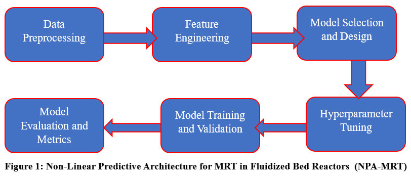 Figure 1 depicts the Non-Linear Predictive Architecture for MRT in Fluidized Bed Reactors (NPA-MRT), which combines machine learning models such as Neural Networks, Random Forest, and Linear Regression to forecast Mean Residence Time using essential reactor parameters. This architecture excels in capturing intricate non-linear patterns in the data, delivering better accuracy and reliability in MRT prediction, with Neural Networks showing superior performance over conventional models.