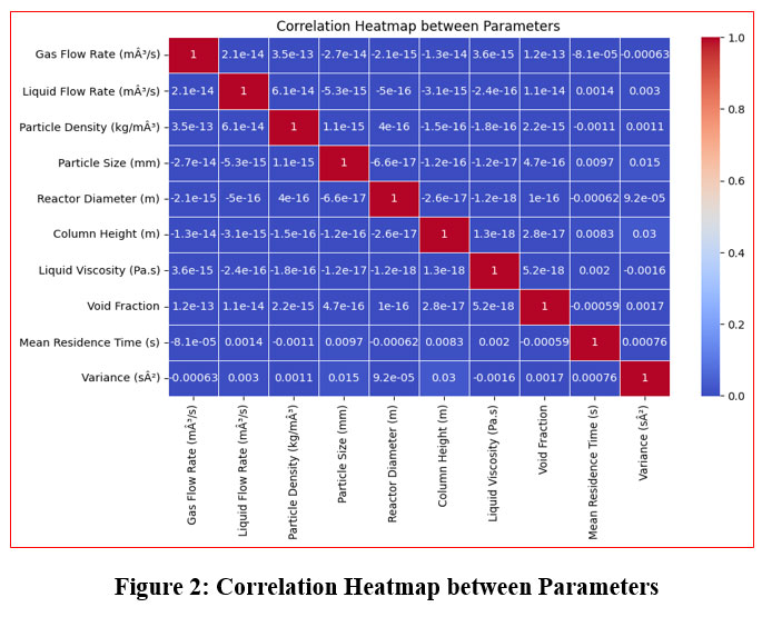Figure 2 illustrates the relationships among key variables in the Extended Three-Phase Fluidized Bed Reactor RTD Dataset. Significant correlations, such as those between gas flow rate and void fraction, highlight dependencies that can be utilized to enhance the predictive power of machine learning models. Additionally, the heatmap uncovers potential multicollinearity among features like liquid viscosity and particle density, which could impact model accuracy and performance, indicating that preprocessing methods such as feature selection or dimensionality reduction may be required to improve model robustness.