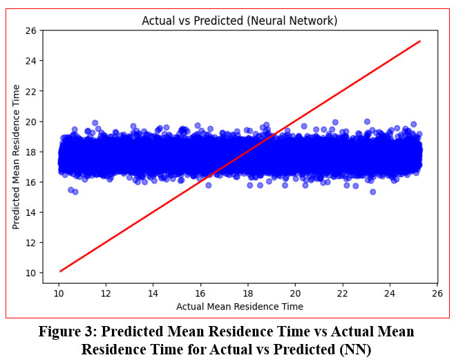 Figure 3 presents a comparison between the predicted mean residence time values from the Neural Network model and the actual values from the dataset. The plot reveals that while the model captures the overall patterns, discrepancies between predicted and actual values remain, indicating a need for further tuning or additional feature engineering to enhance accuracy. The scatter plot demonstrates that the model has difficulty handling variability, as evidenced by the spread of points away from the ideal diagonal line, where predicted and actual values would align. This suggests that while the neural network identifies some relationships, non-linearities or outliers may still affect its performance.