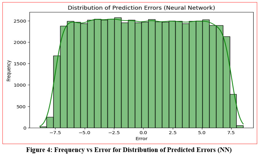 Figure 4 shows the distribution of errors in the Neural Network’s predictions for mean residence time, indicating how frequently different error values occur. The plot reveals that most errors are clustered near zero, suggesting that the model’s predictions are generally accurate, though the spread of errors points to instances of over or under-prediction, implying that additional tuning or preprocessing may enhance performance. This error distribution also highlights some variability, with larger deviations suggesting potential outliers or complex non-linear relationships in the data that the neural network hasn’t fully accounted for, possibly due to dataset complexity or noise.