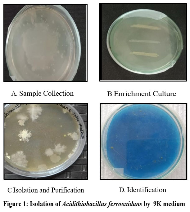 The isolation of Acidithiobacillus ferrooxidans involves collecting samples from environments rich in sulfide minerals, such as acid mine drainage, coal mines, or bioleaching sites (Fig: 1), (Table: 1).