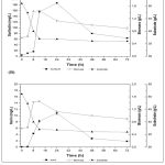 Graph 1: Time-course profiles of substrate, biomass, and lipopeptide concentrations produced by B. subtilis UFPEDA 438 over time (36°C, 200 rpm agitation). (A) Surfactin concentration; (B) Iturin concentration. |