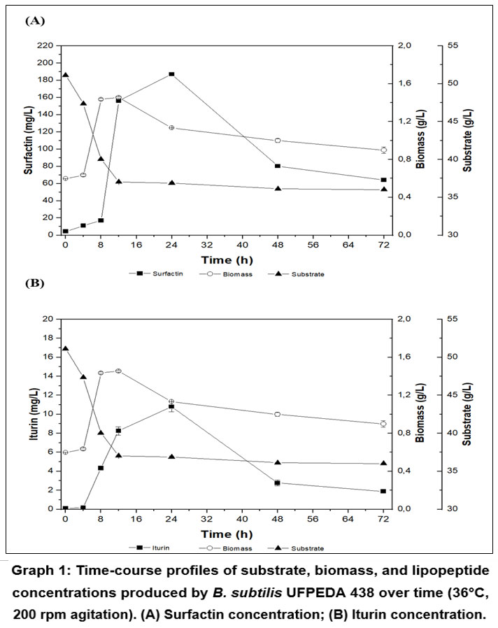 The lipopeptides surfactin and iturin were produced by submerged fermentation using sugarcane as a source of carbon and energy. Graph 1 shows the substrate consumption profile, cell concentration, and biosurfactant production by B. subtilis UFPEDA 438 after 72 hours of fermentation.