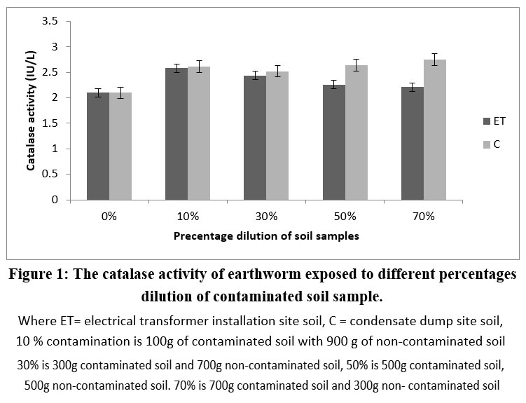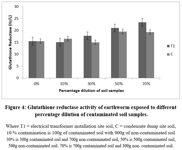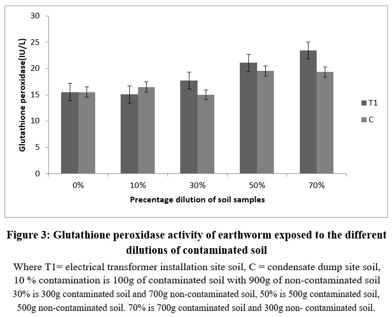 ABSTRACT: Earthworms play an important role in the soil ecosystem, it promotes soil structure and fertility. This study was designed to assess the toxic outcome of contaminated soil samples from an electrical transformer site and condensate dump site on the antioxidant enzymes of earthworms that are exposed to different dilutions of the polluted soil. The effects were assayed by measuring superoxide dismutase, catalase, glutathione reductases, glutathione peroxidase and metallothione activities, respectively. The result exposed a substantial rise in the activities of the enzymes assayed in a percentage dependent manner. It is concluded that the antioxidants are directly involved in the adaptive response of earthworm survival in a contaminated environment. The activities of glutathione reductase expressed as mean ± SD revealed a substantial rise in the contaminated soil samples compare to the control. Metallothione activities of earthworm exposed to different percentage soil dilutions rom condensate dumpsites, and electrical installation locations, revealed a reduction in metallothionine activities. Contaminants in the soil samples had a marked increase in catalase, SOD, and GR activities of earthworms after exposure. Therefore, one can infer that the contaminants in dumpsites and condensate may have severe effect on the health of the soil ecosystem and biodiversity.