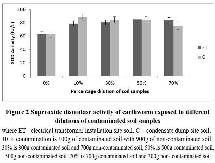 Figure 2: Superoxide dismutase activity of earthworm exposed to different dilutions of contaminated soil samples |