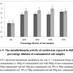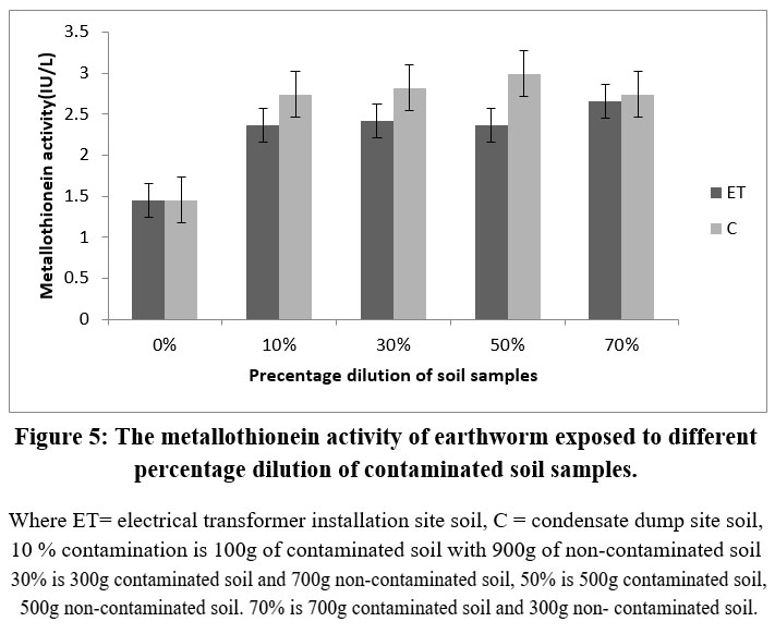 Figure 5: The metallothionein activity of earthworm exposed to different percentage dilution of contaminated soil samples. |