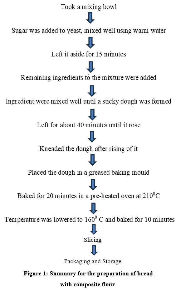 The bread was prepared in food laboratory using the protocol15 given in Fig 1.The first step involved thorough mixing of sugar and yeast in a large dish with warm water. This mixture was allowed to stand alone for 10 to 15 minutes.