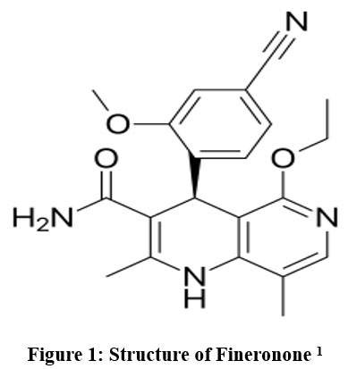 Finerenone ((4S)-4-(4-Cyano-2-methoxyphenyl)-5-ethoxy-2,8-dimethyl-1,4-dihydro-1,6-naphthyridine-3-carboxamide), C21H22N4O3, having MW 378.432 g·mol−1.1,2 (Chemical structure shown in figure 1) is a non-steroidal mineralocorticoid receptor antagonist.3,4 Finerenone is prescribed to mitigate the risk of persistent reduction in glomerular filtration rate, end-stage renal disease, cardiovascular mortality, and hospitalization due to heart failure in individuals with chronic renal disease linked to type II diabetes mellitus.5,6