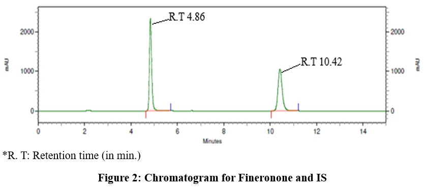 Selection of Internal standard: Through multiple trials with various internal standards (IS), dapagliflozin was chosen as the IS due to its favourable chromatographic response along with finerenone (FIN) under the optimized chromatographic conditions outlined above. (R.T for FIN was 4.86 min, R.T for IS was 10.42 min). Figure 2 represents the chromatogram for finerenone and IS. Theoretical plates were 13284 and 16343 resp.