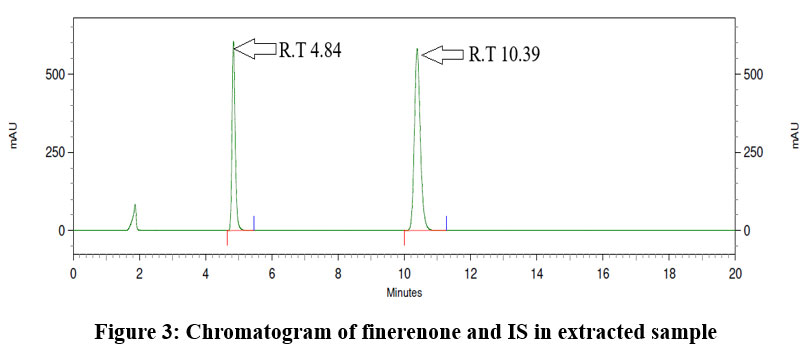 Optimized extraction method: Protein precipitation provides numerous benefits in bioanalytical techniques, such as simplicity, rapidity, and cost-efficiency.18 475 µl plasma was combined with 25 µl of finerenone working solutions and vortexed for 1 minute. Subsequently, 50 µl of 75 µg/ml Dapagliflozin (IS) in a methanol solution was added and vortexed for an additional 1 minute. Added 20 µl of 2% formic acid and vortexed for 1 minute. Added 1 ml of acetonitrile and vortexed for 2 minutes. Centrifuged at 4000 RPM for 3 minutes. 0.5 ml of supernatant was collected and introduced in the HPLC system. Fig 3 represents the chromatogram for extracted sample of finerenone and IS in plasma.