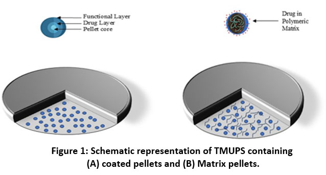 Figure 1: Schematic representation of TMUPS containing (A) coated pellets and (B) Matrix pellets. |