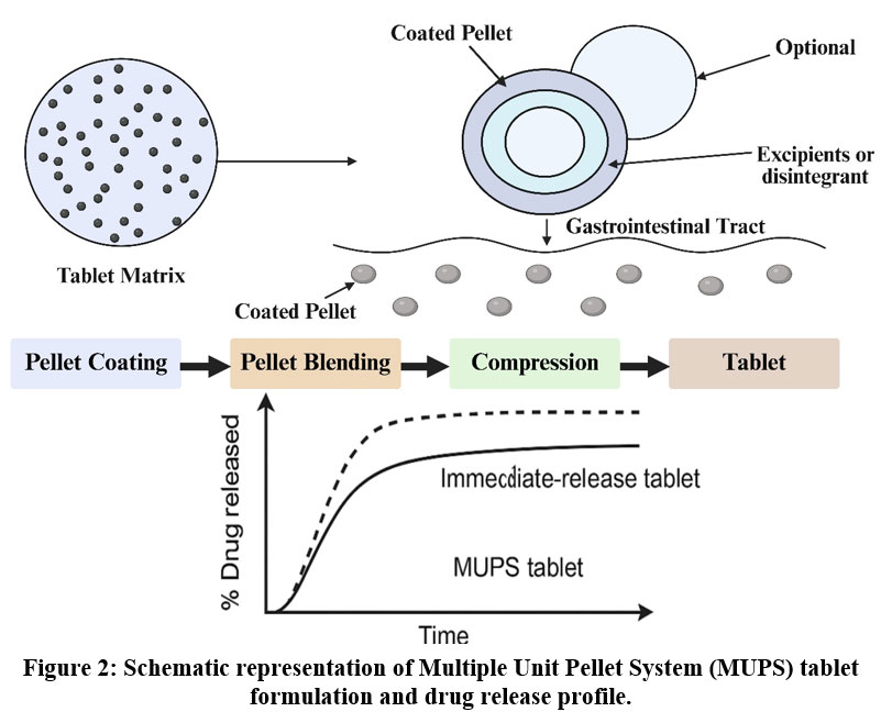 When the route is Oral, Solid dose forms serve as the principal means of medicine delivery. They significantly vary in different parameters of units per dose, encompassing both single-unit dosage forms (SUDF) as well as multiple-unit dosage forms (MUPS).1 Unlike SUDF, the primary attribute of MUPSs is their minimal chance of the dumping of dose as well as rapid gastric emptying, as they can be more uniformly dispersed in the gastrointestinal region.2 This leads to diminished side effects, enhanced bioavailability, reduced variability in medication release, and other notable characteristics. They provide the benefits of enhanced patient adherence due to the simplicity of administration and the ability to customize dose fractionation. Moreover, MUPS can enable the concurrent delivery of incompatible pharmaceuticals or a medication within a normally incompatible excipient matrix by physical segregation.3