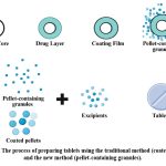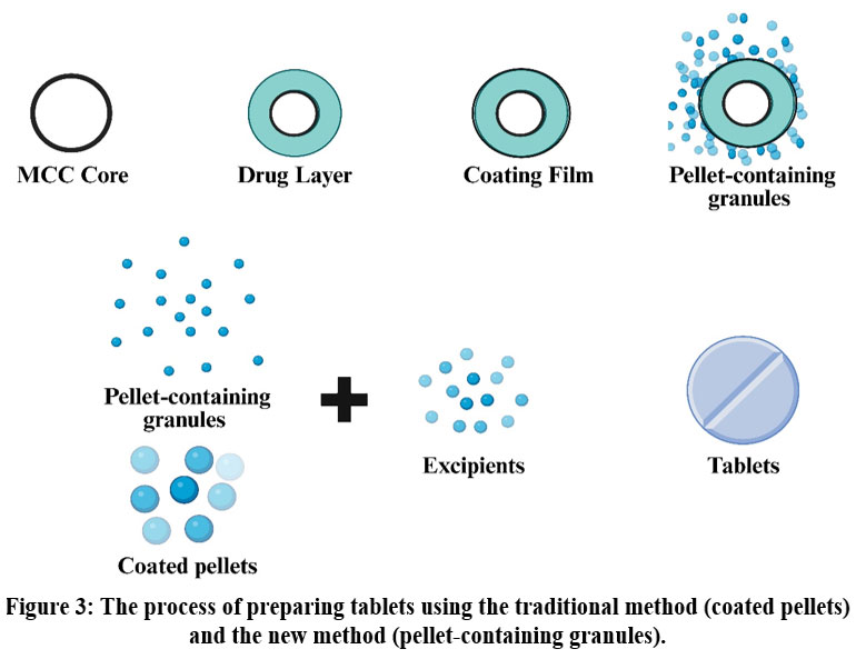 Figure 3: The process of preparing tablets using the traditional method (coated pellets) and the new method (pellet-containing granules). |