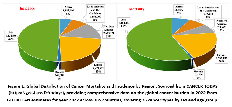 Cancer is a major threat to the health of people everywhere. Cancer poses a significant global health challenge, with approximately 19.7 million new cases and nearly 10 million deaths reported worldwide in 2022 (Fig.1).9-11 The GCO’s 2022 data reveals the global cancer burden and emphasizes the intricate interactions between hereditary, environmental, and lifestyle factors.11 The patterns of cancer incidence and mortality vary significantly across regions, underscoring the need for region-specific strategies to address this disease effectively.10,11