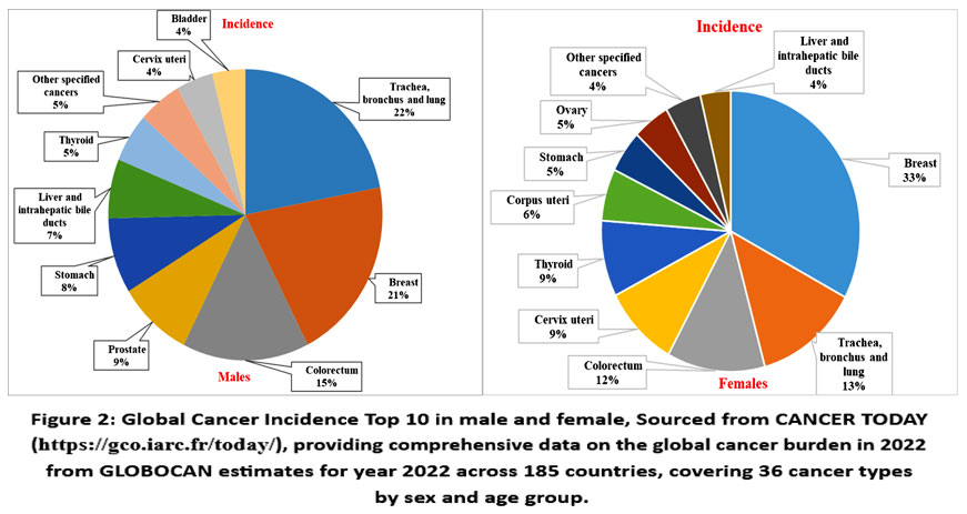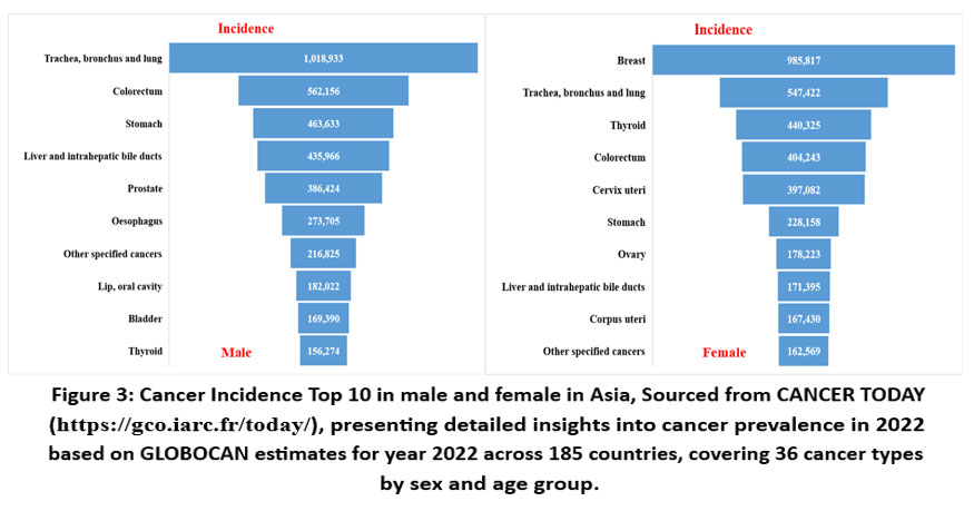Globally, cancers of the trachea, bronchus, and lung are among the most common and are leading contributors to cancer mortality, particularly among males.10 In contrast, breast cancer remains the most prevalent cancer among females and a significant cause of cancer-related deaths (Fig.2).11 Asia, home to a substantial portion of the global population, bears the highest cancer burden (Fig.1). It accounts for a significant share of global cancer cases and deaths, with lung cancer leading as the primary cause of mortality in males and breast cancer ranking highest in incidence among females (Fig.3).10,11