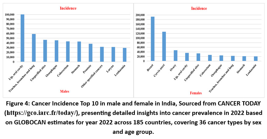 In India, the trends align with these broader patterns, with breast cancer being the most common and fatal cancer among females. For males, lip and oral cavity cancers contribute significantly to the national cancer burden (Fig.4).10,11 These variations emphasize the importance of tailored public health strategies to address specific cancer types within distinct demographic and geographic contexts.