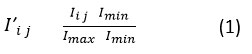 For intensive normalization, the variability is measured in HU (Hounsfield Units) across every CT-DICOM, the images are normalized to standard intensity ranges. The min-max normalization technique is applied for each image pixel Ii,j. The normalization equation is expressed in Equation 1.