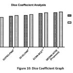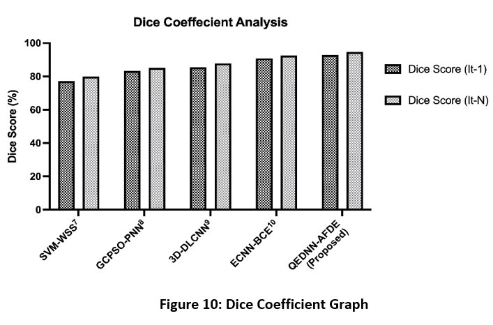The comparative result analysis of the dice coefficient metric is shown in Figure 10. This metric is a spatial overlap to evaluate the segmentation quality. The proposed QEDNN-AFDE achieved a dice score of 94.6%, demonstrating its ability to localize and segment the lung nodules in CT-DICOM images accurately. This was achieved by quantum Mask-RCNN, which enhanced the ROI boundaries through quantum-assisted attention mechanisms. QHE and WEF ensure edge preservation to improve ROI mask clarity and alignment with actual nodular structures. QEDNN-AFDE identifies irregular shapes, small tumors, and overlapping anatomical structures in the DICOM dataset. The model minimized FNR within nodules and reduced false positive markings outside the target areas. The consistent results with high-overlap segmentation output are validated across multiple epochs and iterations. This model helps in pre-treatment planning, surgical mapping, and tumor progression analysis.