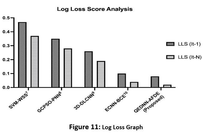 A comparative analysis of the logarithmic loss of different models is shown in Figure 11. It evaluates the confidence of probability-based predictions, where lower values indicate fewer errors. The proposed QEDNN-AFDE achieved low log loss due to a robust probabilistic learning design. As QDNN uses the parameter shift rule, the prediction probabilities are maximized in all iterations. This strategy is mainly used in borderline cases, where overconfident misclassification scores are standard in deep neural networks. The low log loss validates the ability of the proposed quantum-based model to generate reliable confidence scores, which are essential for clinical decision-making, especially in automated reported systems to assess diagnostic risk.