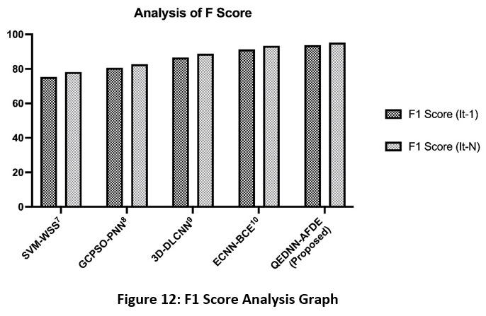 Figure 12 shows the harmonic mean analysis called F1 Score of the proposed QEDNN-AFDE to evaluate underclass imbalance, which is common in clinical datasets. The proposed work shows a remarkable 95.2% F1 score, which signifies its balanced performance in detecting TPR and avoiding False rates. The hybrid quantum convolutional layers extracted spatial-temporal features that preserved essential tumor patterns in low-contrast regions. This dynamic learning strategy allows the proposed QEDNN-AFDE model to maintain high performance and consistency across all three target classes. A high F1 score reflects the diagnostic fidelity of the quantum model and highlights the capability to generalize input conditions and imaging variations across many patients. This will act as a pre-requisite for AI-based real-time deployment in radiology workflows.