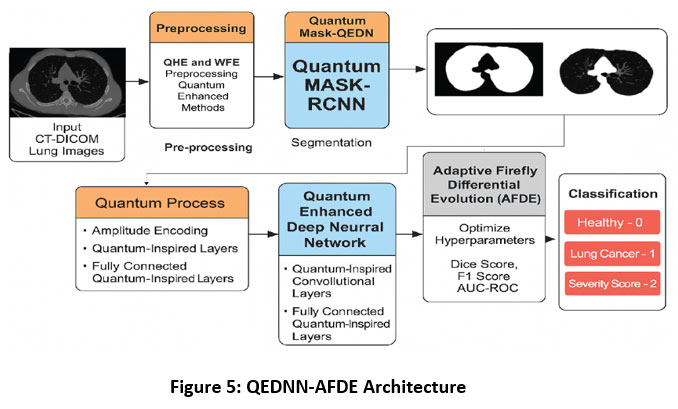 ABSTRACT: To propose a hybrid quantum-based deep learning model to detect malignant lung nodules and accurately classify disease severity. Bio-inspired techniques are integrated to optimize the learning rate for robust generalization. A Hybrid Quantum-Enhanced Deep Neural Network (QE-DNN) combined with a Quantum Convolutional Neural Network (Q-CNN) is used to extract the multi-scale spatial patterns from high-resolution CT-DICOM images. To perform deep segmentation, Quantum Mask-RCNN is used to isolate the ROI from the images effectively. A bio-inspired Adaptive Firefly-Differential Evolution (AFDE) optimizer is employed to fine-tune the learning architecture. Quantum histogram equalization and wavelet fusion are incorporated as data pre-processing methods to retain critical edge and intrinsic features. CT-DICOM dataset is used for evaluation which consists of 25,1135 images with a resolution of 512x512 pixels. The performance is assessed in MATLAB, TensorFlow Quantum, and IBM Qiskit tools by comparing the proposed work with existing models such as SVM-WSS, GCPSO-PNN, 3D-DLCNN, and ECNNDE-BCE. The proposed QEDNN-AFDE quantum bio-inspired nodule detection strategy enhanced the generalization capability by exploring wider with proven results of 96.4% accuracy, 95.2% sensitivity, 95.8% specificity, 95.2% F1 score, 94.6% dice coefficient, 0.02 Log Loss and AUC-ROC with 0.95 TPR and 0.05 FNR. The proposed QEDNN-AFDE model strengthens the interpretability of deep learning models in medical imaging and sets a new benchmark in quantum-assisted diagnostics in precision oncology. The model shows promising performance in both classification accuracy and severity prediction and outperforms all existing models.