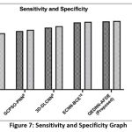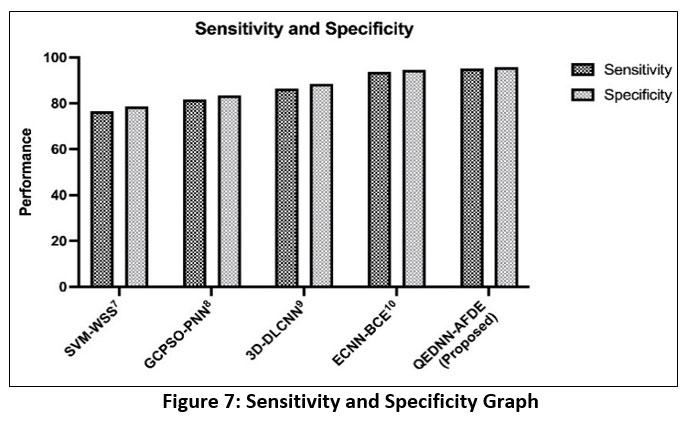 The sensitivity and specificity analysis of the proposed quantum-based bio-inspired QEDNN-AFDE model shown in Figure 7, achieved an exceptional diagnostic performance of 95.2% and 95.8%, reflecting the strength in detecting actual tumor cases by excluding healthy instances. The quantum pre-processed masks ensure accurate region extraction in this model, improving classification boundaries. The quantum-enhanced convolutional layers preserve subtle diagnostic features, and AFDE fine-tunes the hyperparameters to optimize recall and precision simultaneously. QEDNN-AFDE consistently discriminates against cancer and health across varying nodule shapes and densities, helping the model be suitable for deployment in real-time scenarios for cancer screening and severity score analysis in the healthcare sector.