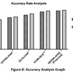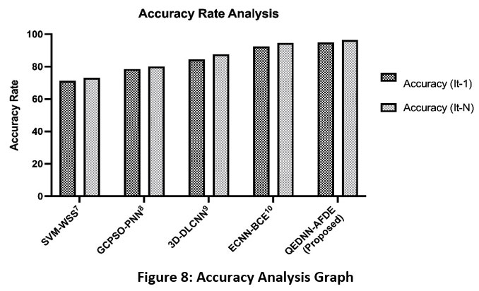 Figure 8 shows the overall accuracy of the proposed QEDNN-AFDE model, which attains 96.4%, confirming its ability to identify and classify the target classes such as cancer, healthy, and severity scores with the help of DICOM image datasets. QEDNN overcomes the limitations of existing models and allows deep extraction and multi-level spatial feature extraction from CT-DICOM images. The AFDE fine-tunes the learning parameters dynamically to ensure deep convergence towards optimal weights across various iterations, which helps to minimize FPR and FNR. The high accuracy of this QEDNN-AFDE reflects the model’s suitability in multi-class environments, which improves the generalization without compromising the diagnostic precision, making the system trustworthy for dynamic integration in clinical decision-support pipelines.