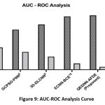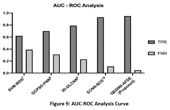 The performance analysis of the AUC-ROC metric is showcased in Figure 9. This metric serves as a robust discriminative evaluation across all target classes. The QEDNN-AFDE exhibits 0.98 AUC, indicating the ability to classify healthy, cancerous, and severity-score lung images. The higher AUC denotes that the hybrid architecture is tuned ideally based on thresholds. The quantum encoding mechanism allows the preservation of high dimensional texture cues while AFDE adjusts the classification boundaries for each class. This dual method resulted in distinct score distributions, making them more evident in ROC space. The multi-class ROC analysis consistently shows high TPR and FPR across all categories, which is scalable for diverse lung pathology datasets. The results of the proposed QEDNN-AFDE model are compared against existing models SVM-WSS7, GCPSO-PNN8, 3D-DLCNN9, and ECNNDE-BCE10. The promising results show that QEDNN-AFDE outperforms the existing models with high discrimination power in accurate classification and smooth diagnosis capability.