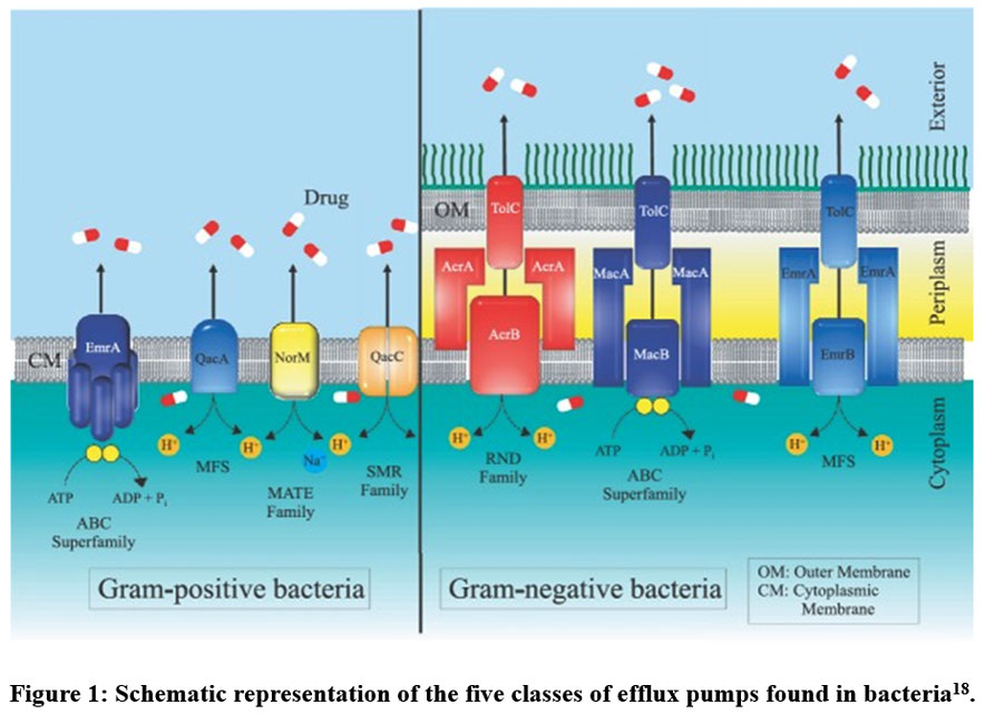 Figure 1: Schematic representation of the five classes of efflux pumps found in bacteria18. |
