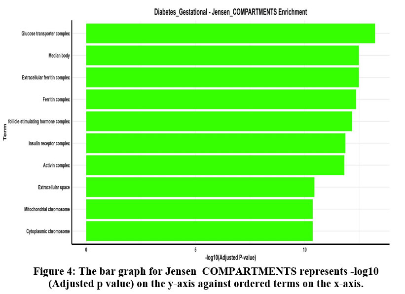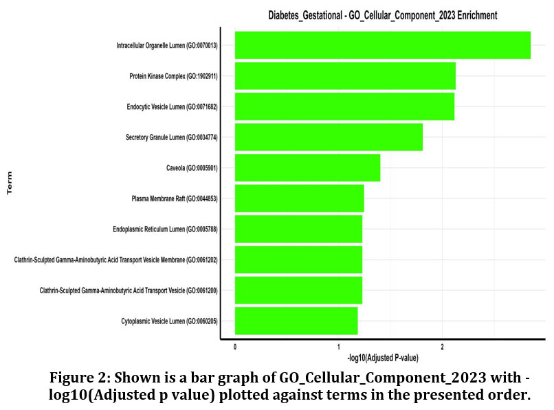 Insights GO_Cellular_Component_2023 and GO_Molecular_Function_2023 analyses have yielded detailed insights into the subcellular and functional nature of discovered genes. The analyses have shown intricate spatial and functional relationships of genetic factors in gestational diabetes. Individual clusters of genes exhibited differential localization between cellular compartments, suggesting complex molecular coordination processes. The analysis of molecular functions revealed the presence of various protein activities, from enzymatic interactions to essential binding processes controlling metabolic responses.(Figure:2, 3).