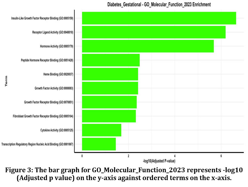 Figure 3: The bar graph for GO_Molecular_Function_2023 represents -log10(Adjusted p value) on the y-axis against ordered terms on the x-axis.