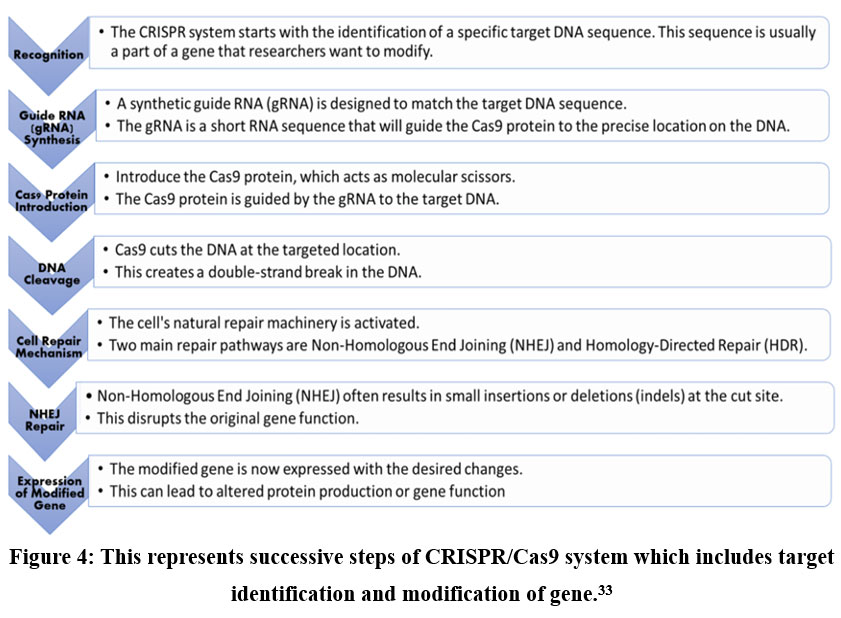 Figure 4: This represents successive steps of CRISPR/Cas9 system which includes target identification and modification of gene.33 |
