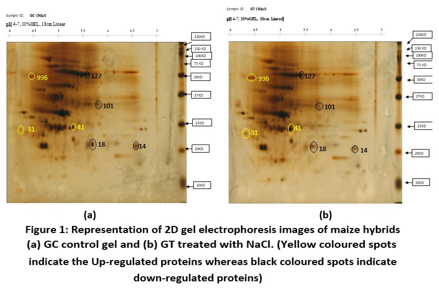 Figure 1: Representation of 2D gel electrophoresis images of maize hybrids (a) GC control gel and (b) GT treated with NaCl. |