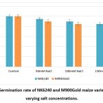 Salt stress adversely affects the growth of the maize plants though the germination rate was quite appreciable. The NK6240 and M900Gold varieties of maize were induced by different salt concentration ranging from 50-150mM NaCl and their rate of germination was found to be decreased with increasing salt concentration due to alleviated osmotic pressure (Graph 1).