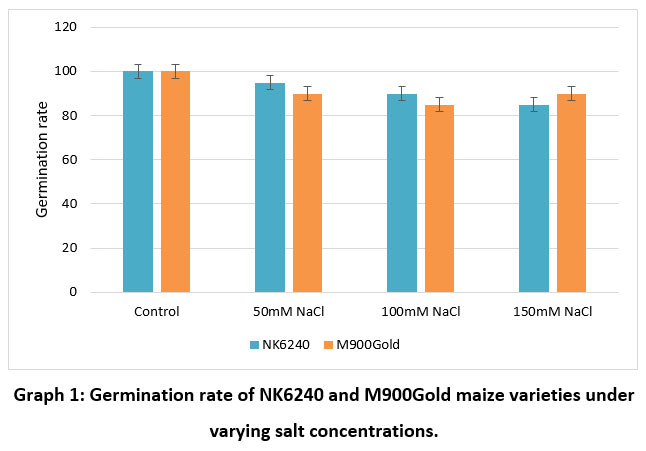 Graph 1: Germination rate of NK6240 and M900Gold maize varieties under varying salt concentrations. |