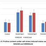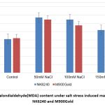 In the case of Malondialdehyde (MDA) The trienoic fatty acids such as MDA directly contribute to reactive oxygen species (ROS) control via non-enzymatic oxidation and is directly correlated with the survival of tissues. The maize plants have shown decreasing trend with increasing salt concentration, exhibiting the adaptable nature of the varieties NK6240 and M900Gold.