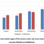 The elevated levels of soluble sugars contribute to tolerance of plants against stress conditions. Similarly, the maize plants have shown increasing levels of TSS with increasing salt concentration . The maize variety M900Gold have shown high levels of TSS than NK6240, indicating its sensitivity against salt stress.