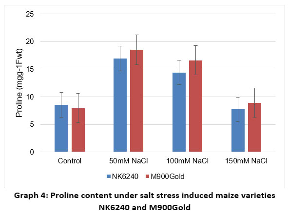 Graph 4: Proline content under salt stress induced maize varieties NK6240 and M900Gold |